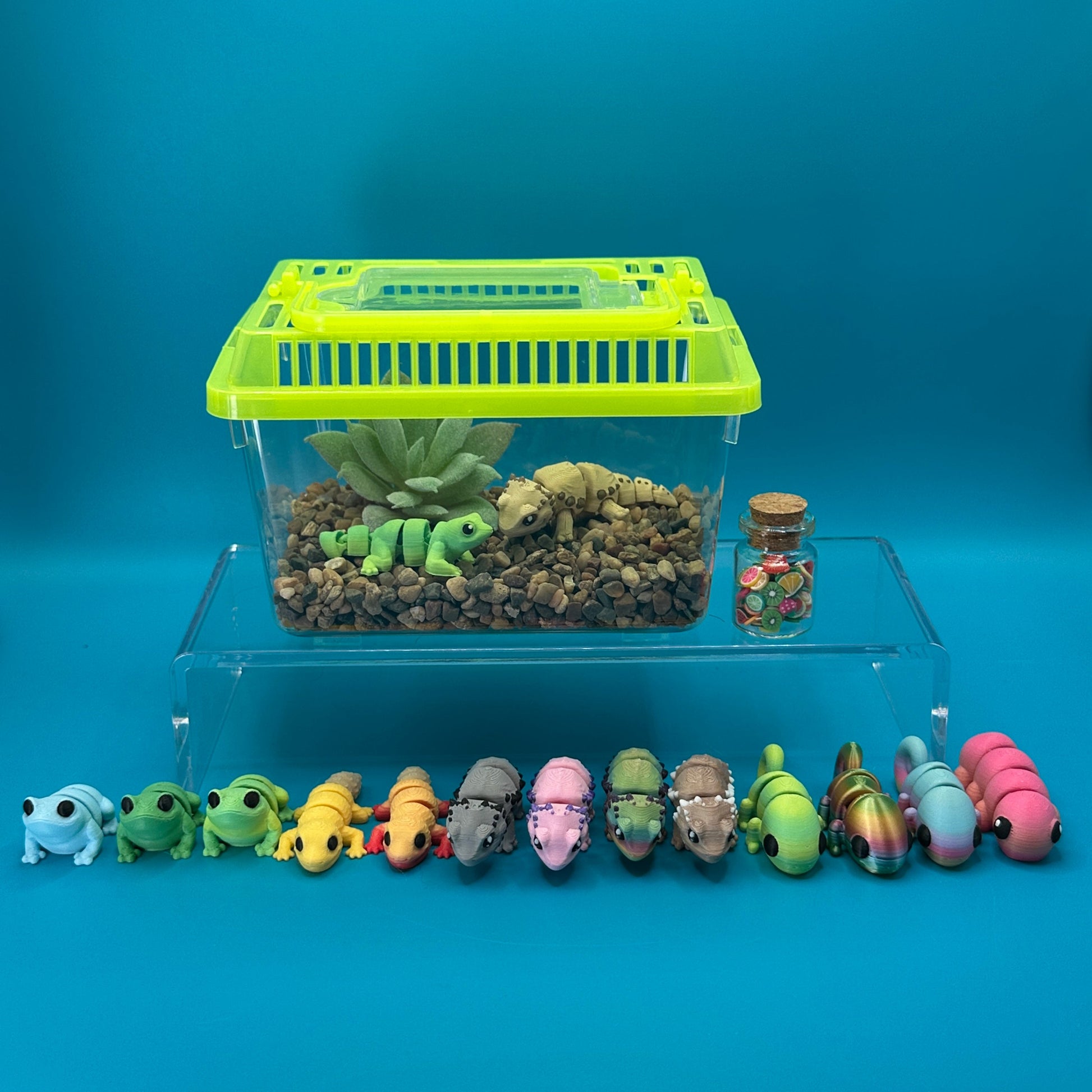 Want reptiles or fish but don't want to deal with feeding them? Look no further than our 3d printed pet kits. Each kit can be customized to include your choice of rocks, animals, plants and container! Just message us after the order, and as long as it's before the item ships and we can customize it for you. Otherwise we'll pack the most appropriate style of rocks and plants based on the selection of creature in the tank.